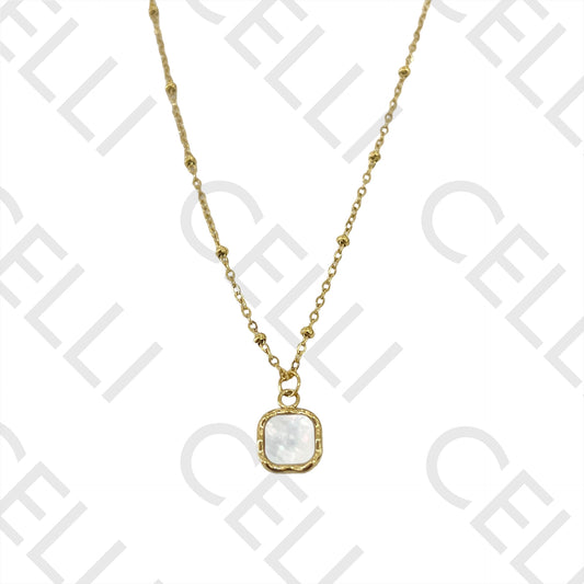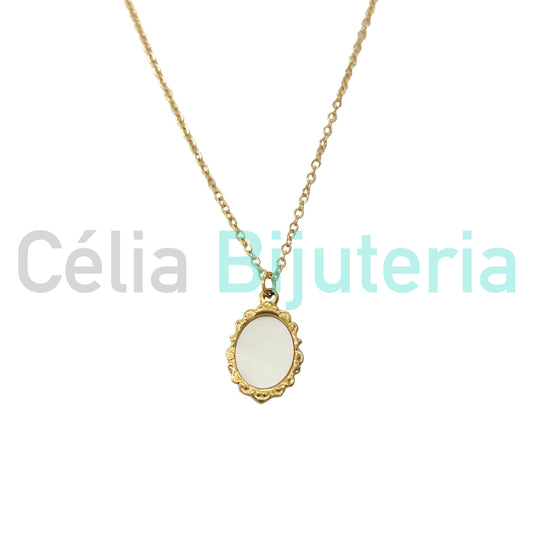 Preço normal €2,50Preço normalPreço unitário / porPreço de saldo €2,50Colar de Aço (malha oval achatada com bolinhas) - medalha quadrada com madrepérola