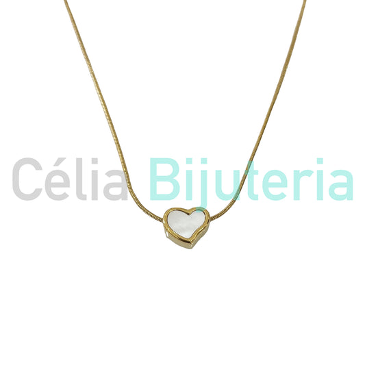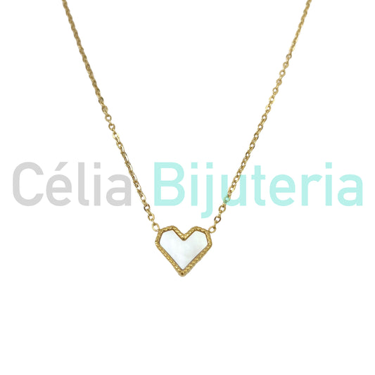 Colar de Aço (malha oval achatada com bolinhas) - medalha coração com madrepérola