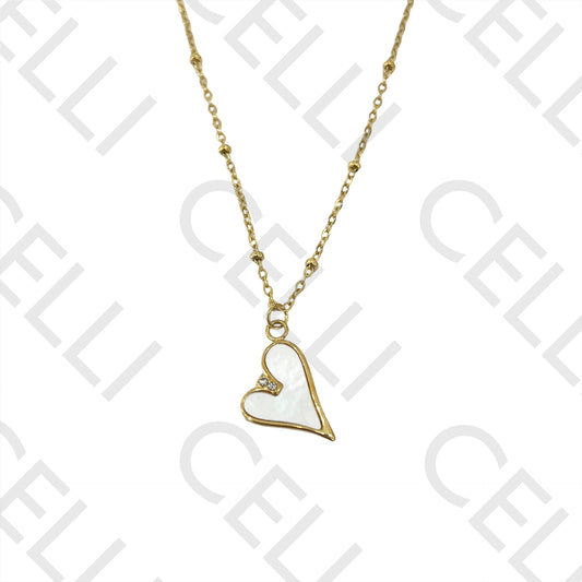 Colar de Aço (malha oval achatada com bolinhas) - medalha coração com madrepérola e brilhantes