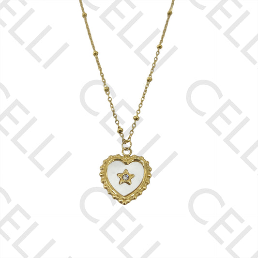 Preço normal €3,00Preço normalPreço unitário / porPreço de saldo €3,00Colar de Aço (malha oval achatada com bolinhas) - medalha coração com madrepérola