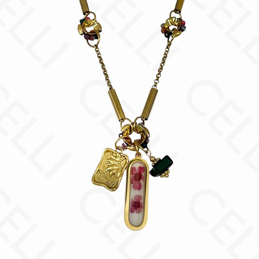 • Collar de acero - múltiples colgantes, flor seca en resina (5 colores)