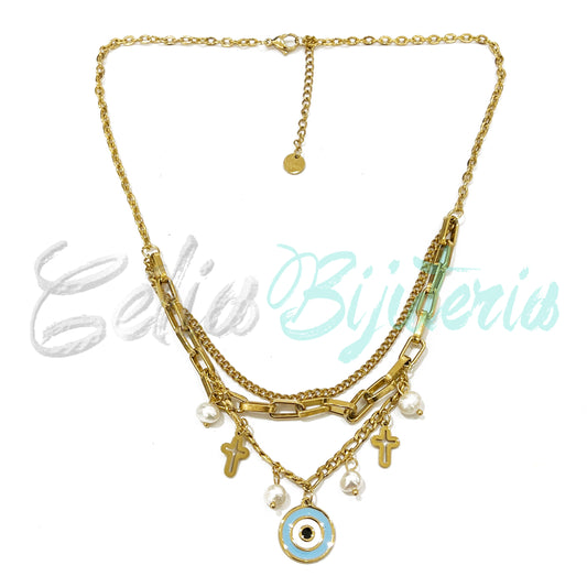 Precio habitual €3,50Precio habitualPrecio unitario / por€5,00Precio de oferta €3,50Collar/Pulsera Triple de Acero con Ojo Turco, Cruces y Perlas de Agua Dulce
