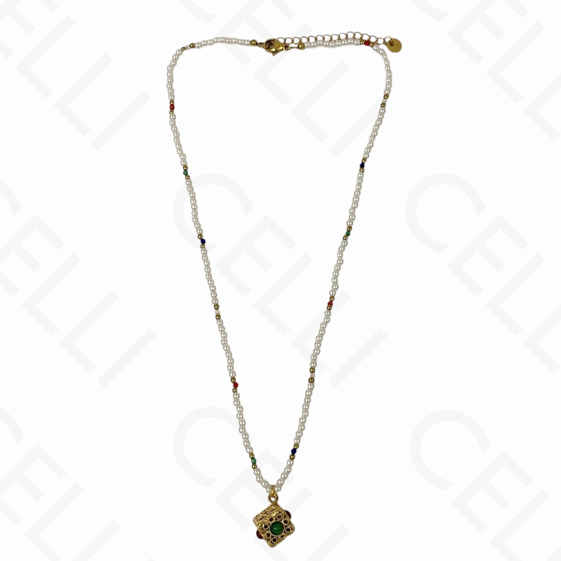 Collar de acero - piedras naturales y perlas, colgante cubo Collar de acero - piedras naturales y perlas, colgante cubo