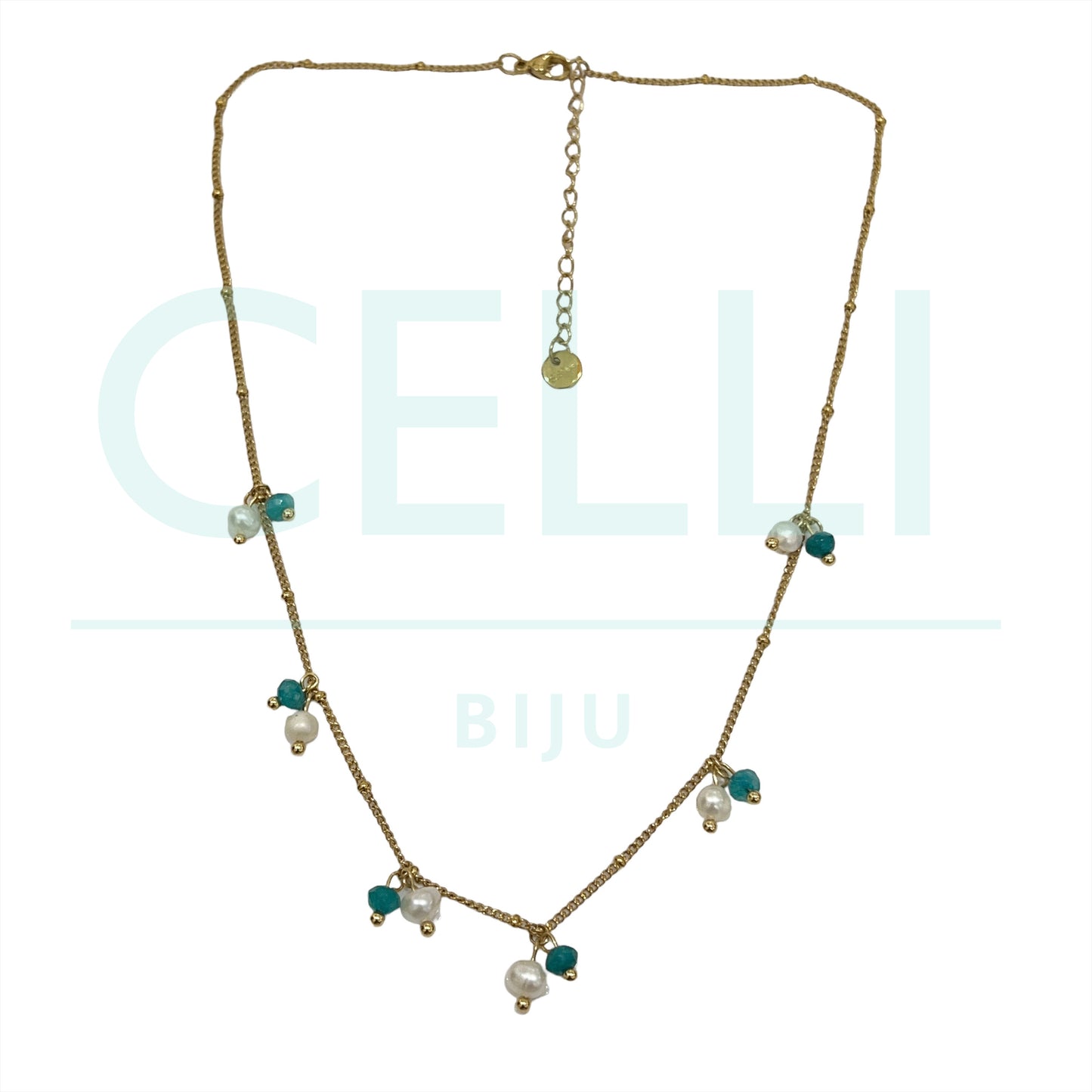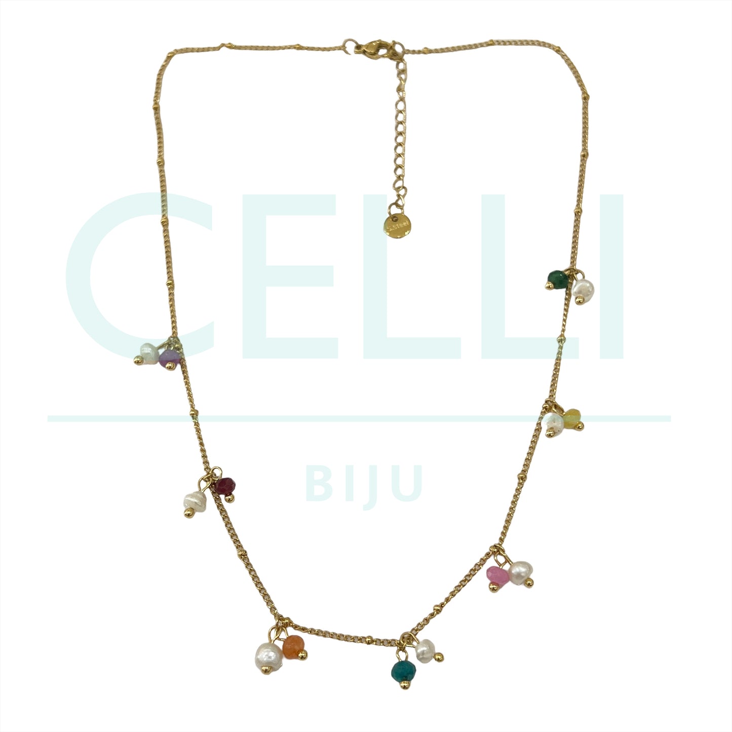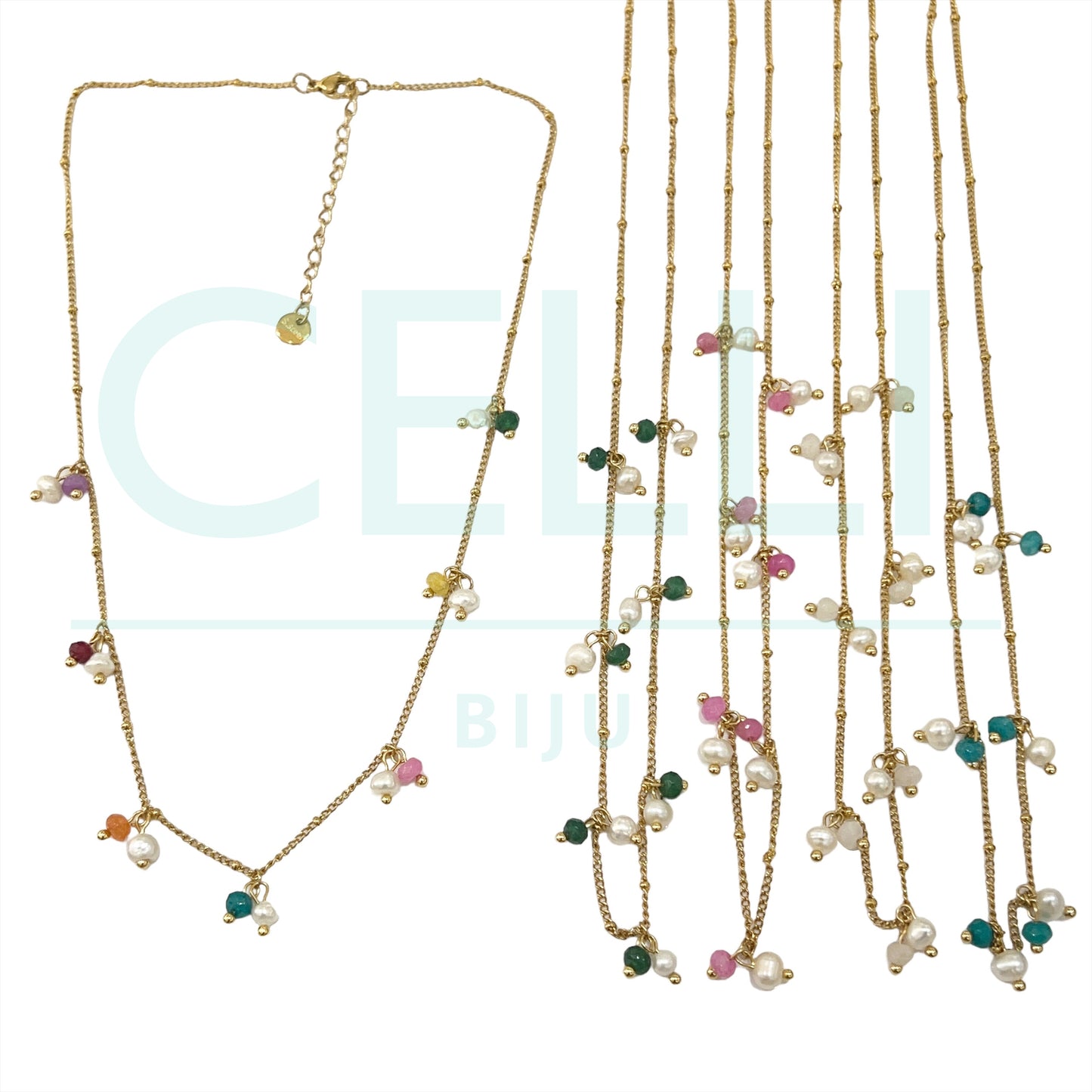 Colar de Aço com pérolas de agua doce e pedras naturais facetados