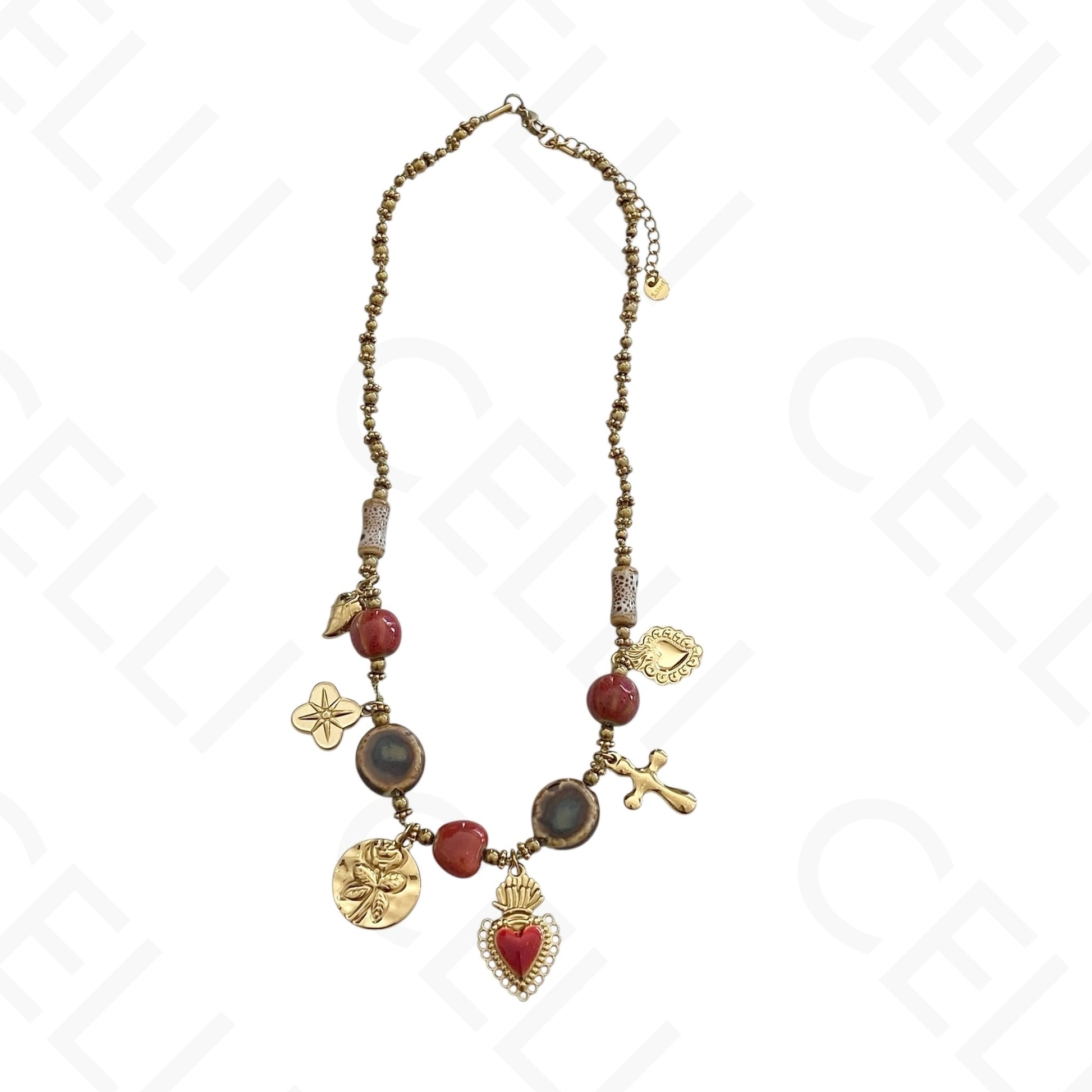 Colar de aço - contas de cerâmica, multi pendentes, sagrado coração