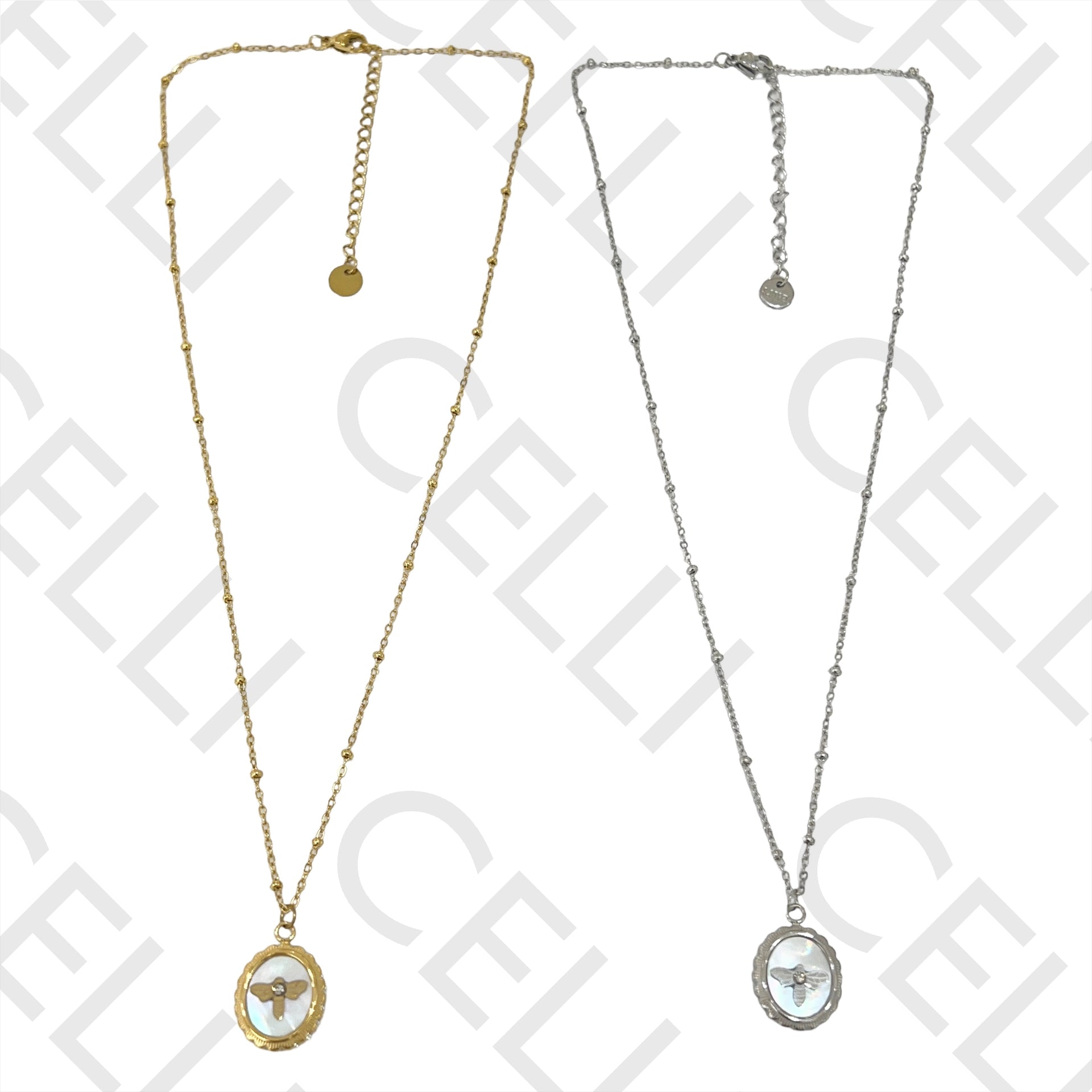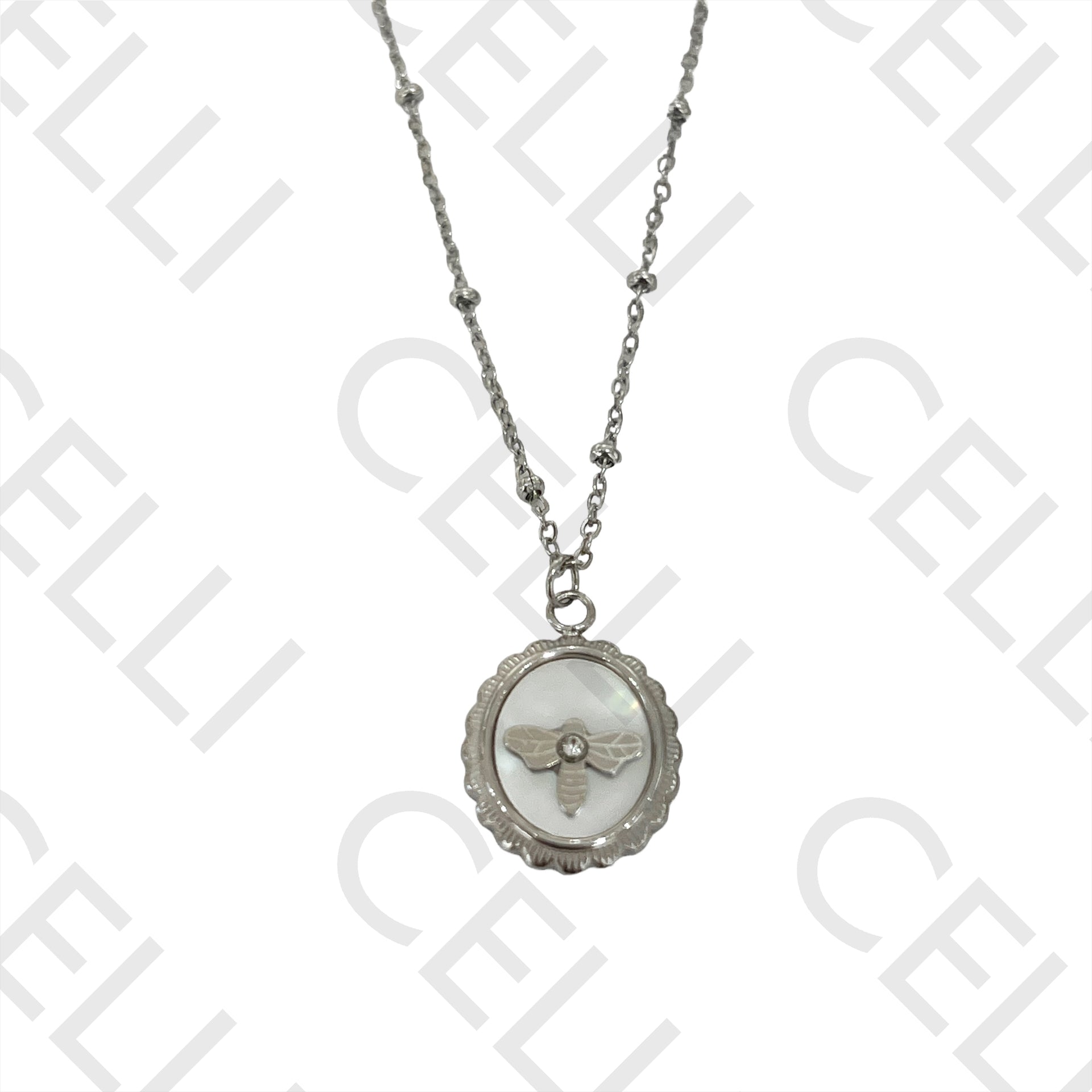 Colar de Aço (malha oval achatada com bolinhas) - medalha abelha e madrepérola