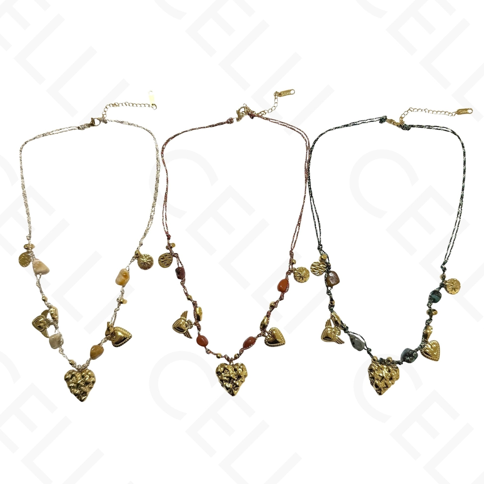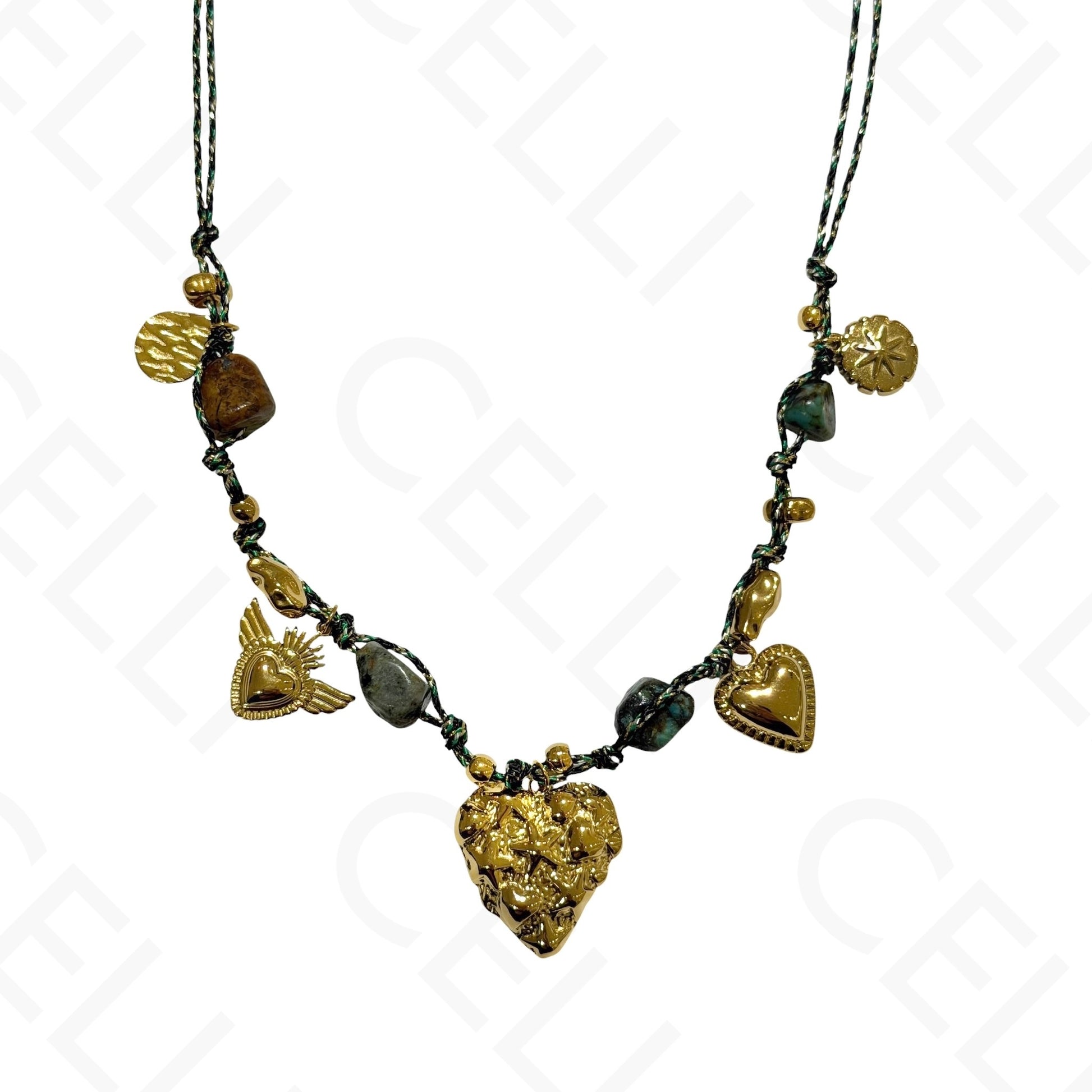 Colar de aço - multi pendente, coração, fio de algodão