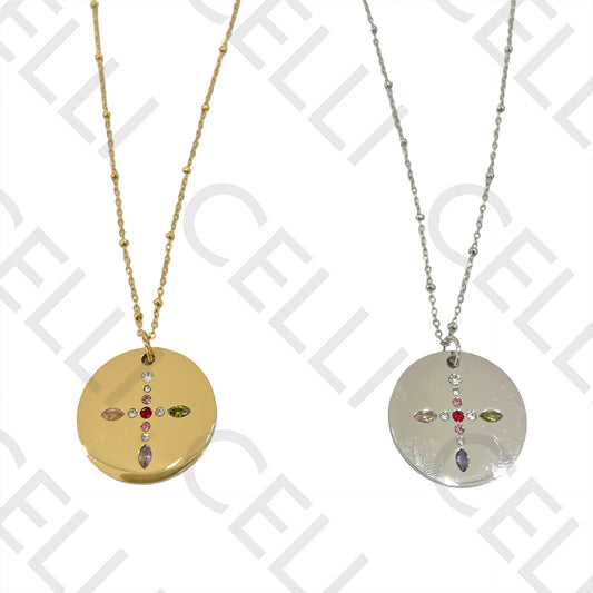 • Colar de Aço (malha oval achatada com bolinhas) - medalha brilhantes coloridos cruz / coração