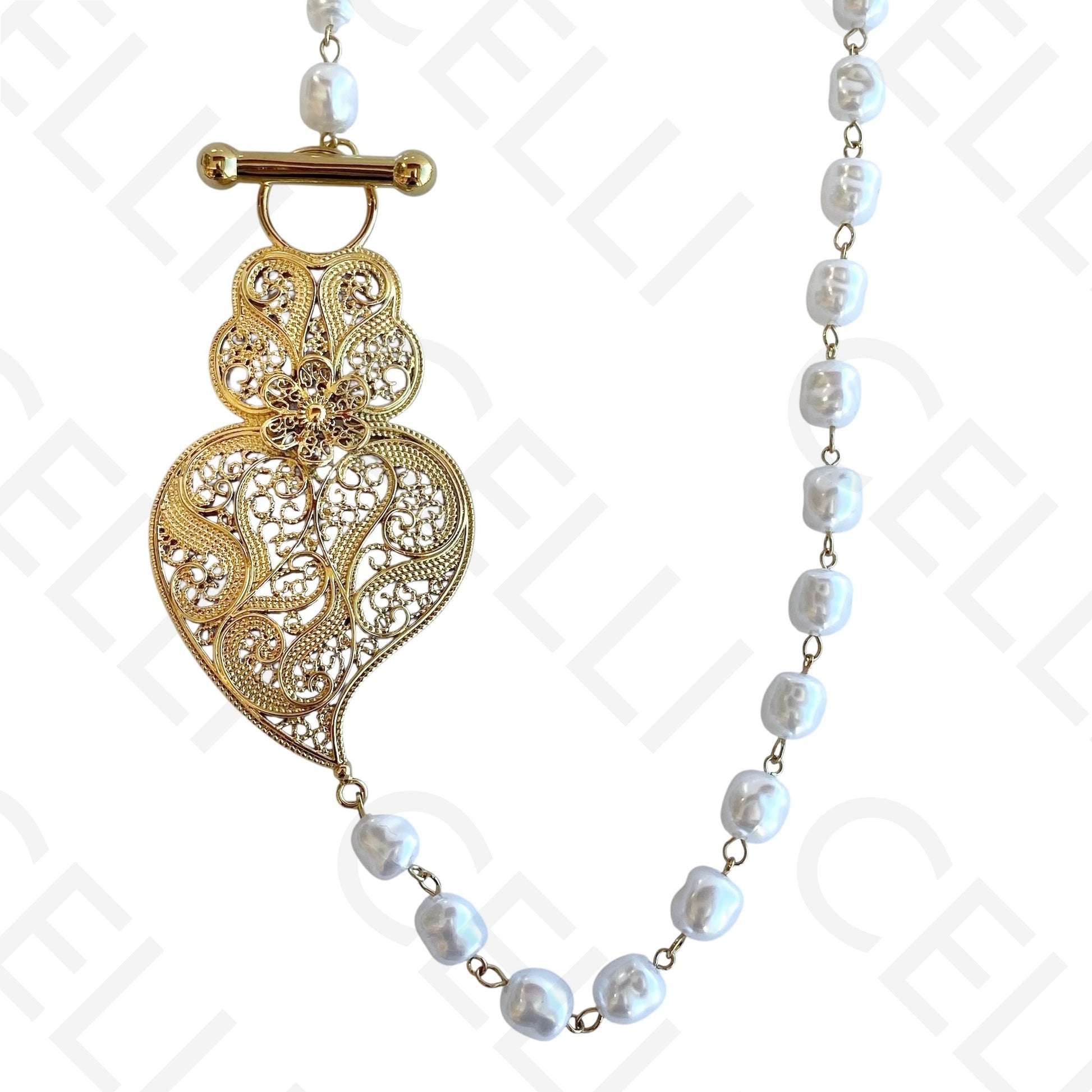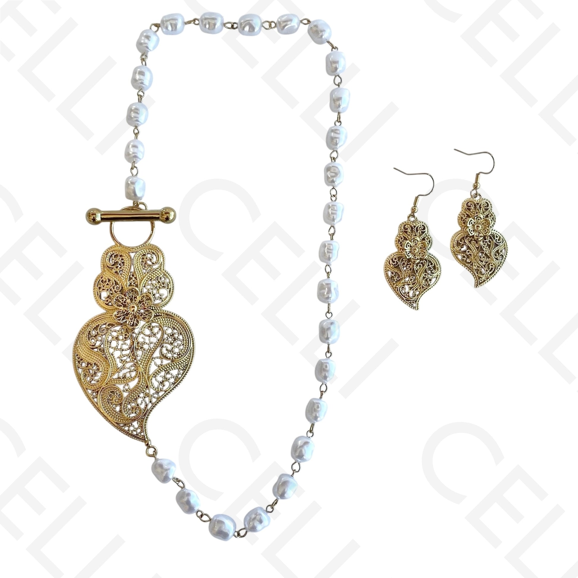 Colar/Brinco de aço -pérolas com pendente coração de viana