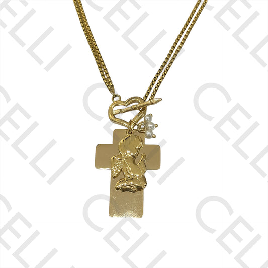 双扣钢制项链 OT - 十字架、天使与珍珠