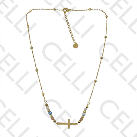 不锈钢项链 - 刻面宝石与水平十字架
