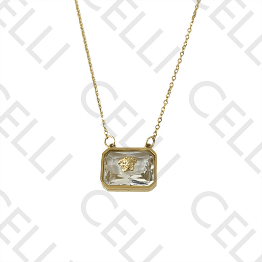 不锈钢项链 - 带狮子头图案的矩形水晶