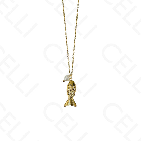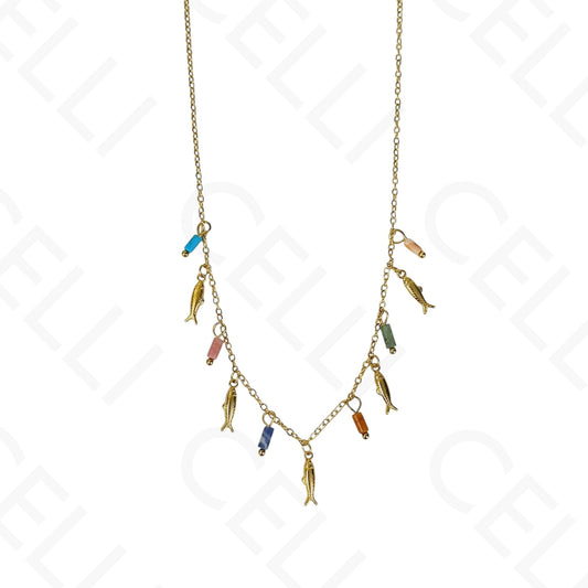 钢制项链 - 多颗鱼形和天然石吊坠