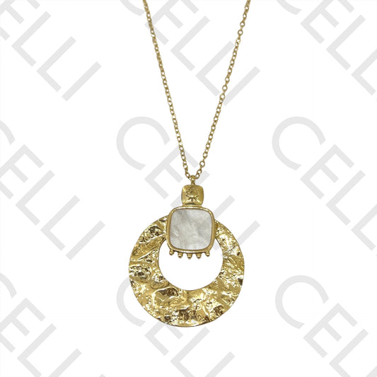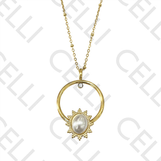 不锈钢项链 - 母贝圆盘与珊瑚奖章